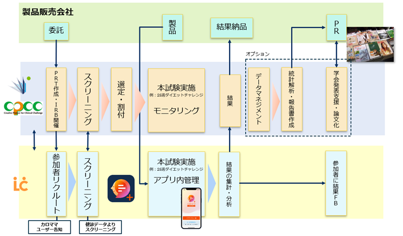 本サービスでは、リンクアンドコミュニケーションが提供する「カロママ プラス」と連携することで、健康意識の高い、幅広い年齢層のモニターを活用し、臨床試験の受託業を営むアイメックRDとCPCCがオンライン臨床試験の運営から成果取得までトータルでサポートいたします。